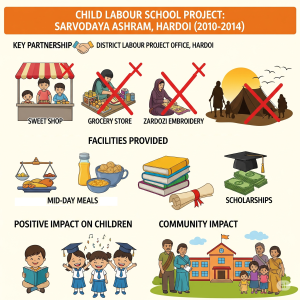 The Sarvodaya Ashram, in partnership with the District Labour Project Office, implemented the Child Labour School project in the Tandiyawan block of Hardoi district, Uttar Pradesh 🇮🇳. The project ran from 2010 to 2014 with the primary goal of providing education to children engaged in child labor.